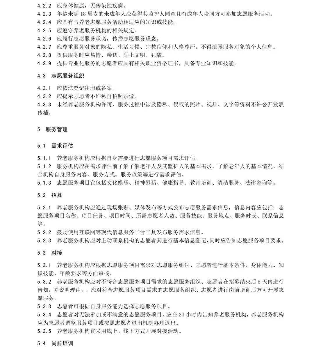 先培训,后服务,服务中还要注意保护老人隐私。征求意见稿提出,养老服务机构应根据志愿服务项目需求,对志愿服务组织、志愿者进行基本条件、身体能力、知识技能、年龄要求等方面审核。符合志愿服务项目需求的志愿服务组织、志愿者,应先进行岗前培训后,方可开展志愿服务。志愿服务组织应提示志愿者不许私自拍照录像。未经养老服务机构许可,服务过程中涉及隐私、侵权的照片、视频、文字等资料不许公开发表传播。