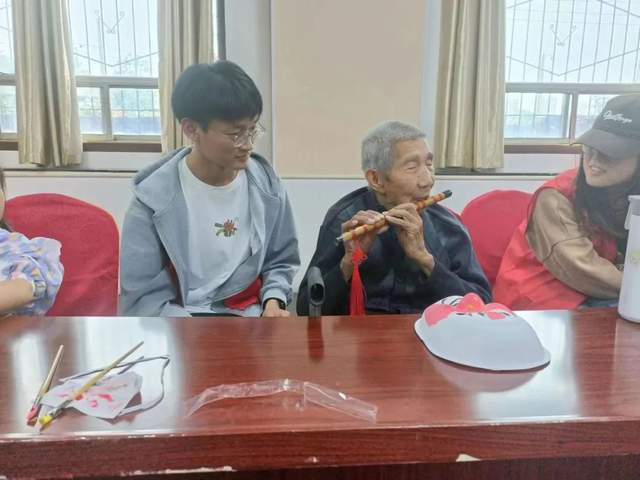 志愿者们准备了文艺节目送给老人们,带领老人们学习画脸谱,老人们与同学们一起载歌载舞,带去了欢笑和快乐。