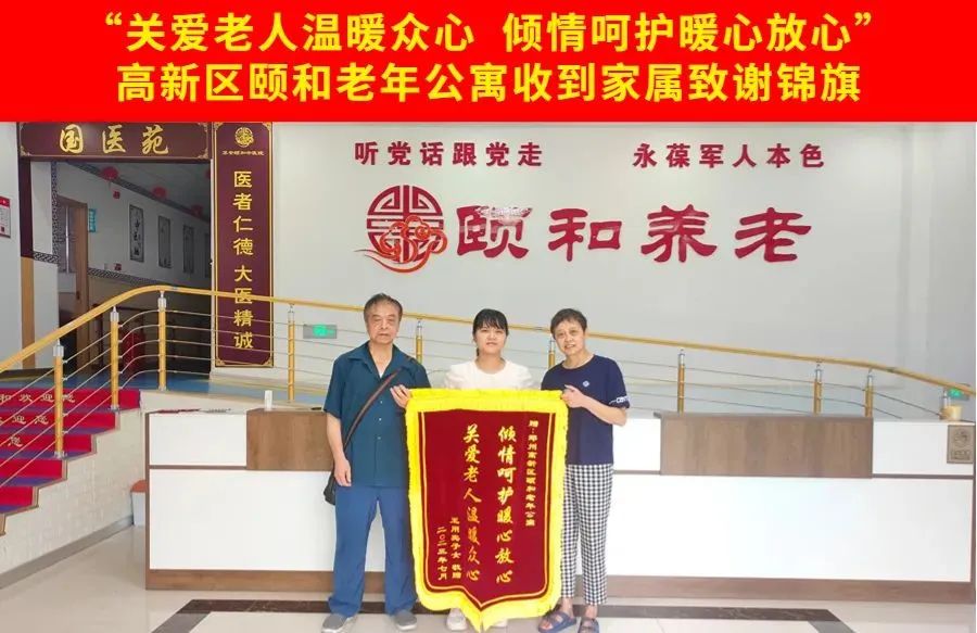 2023年7月19日下午,高新区颐和老年公寓入住长者王奶奶的家属,向公寓送来一面写有“关爱老人温暖众心 倾情呵护暖心放心”的锦旗,对高新区颐和老年公寓全体工作人员热心助老的行为,表示衷心感谢!