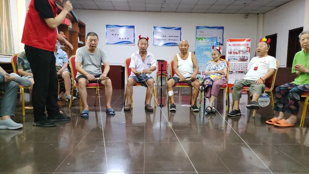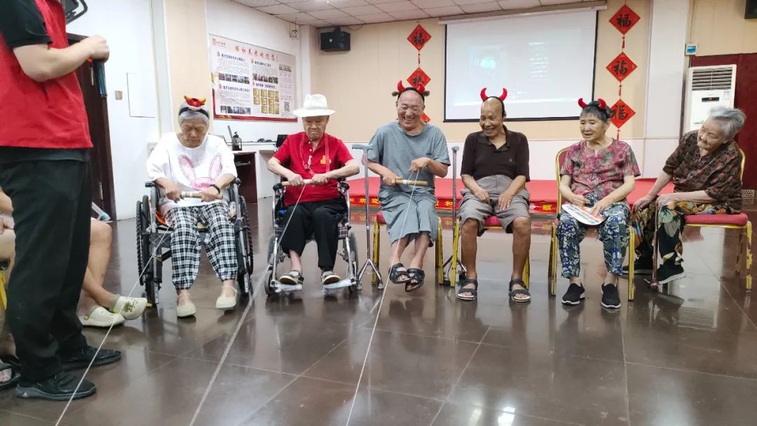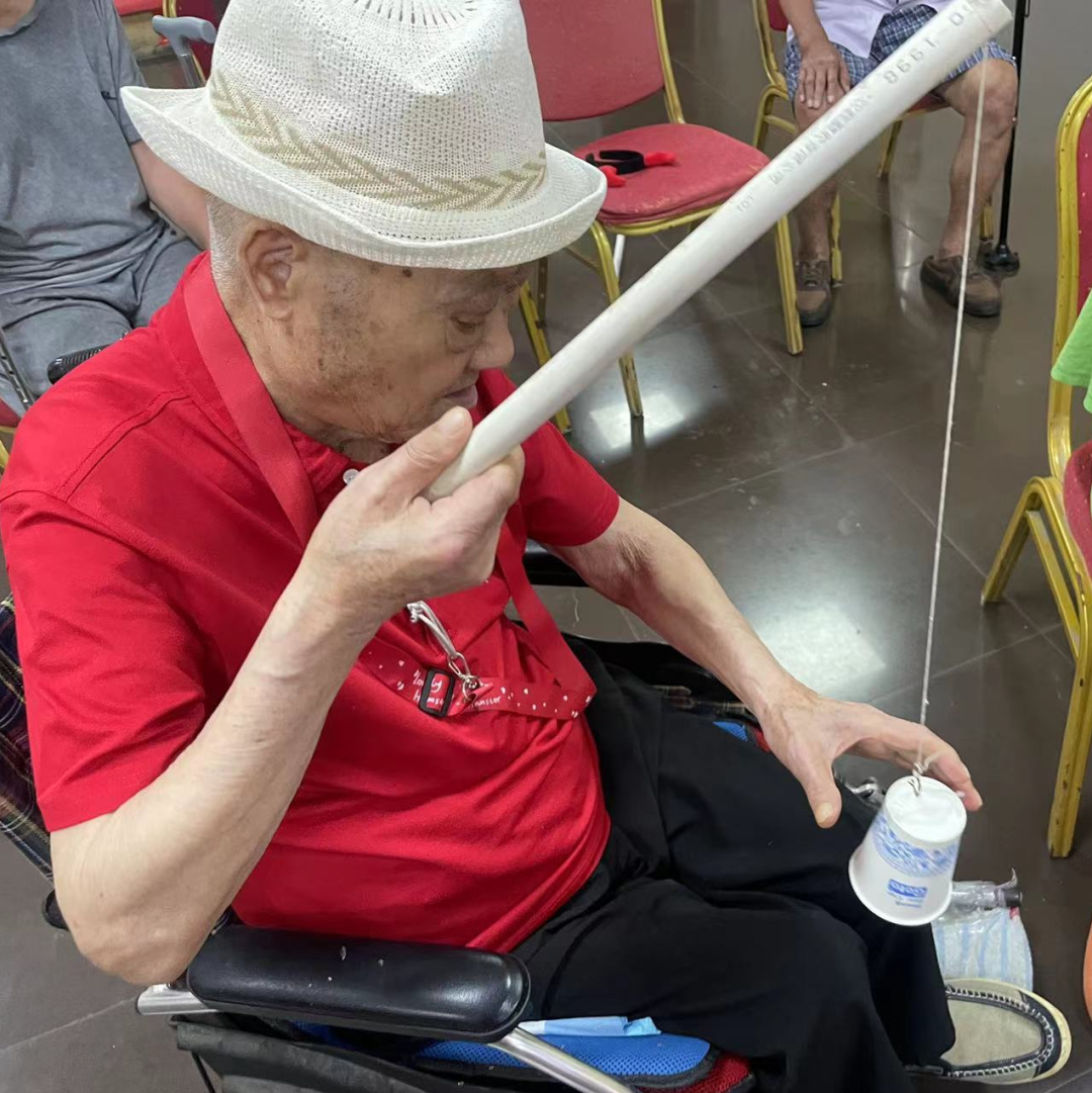 一根绳子、一个瓶子,拉进长者之间的距离,每位长者需要将面前装满水的瓶子通过缠绕在小棒上的绳子拉到自己的位置,率先完成的为第一名,