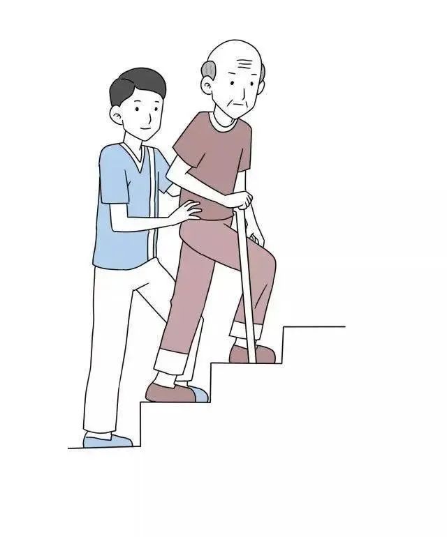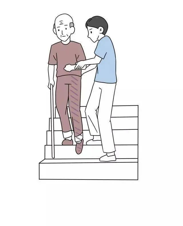 (2)下楼梯:照护人员站在长者前方半步,嘱长者先迈患腿,健腿后跟上。
