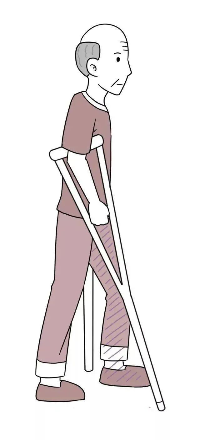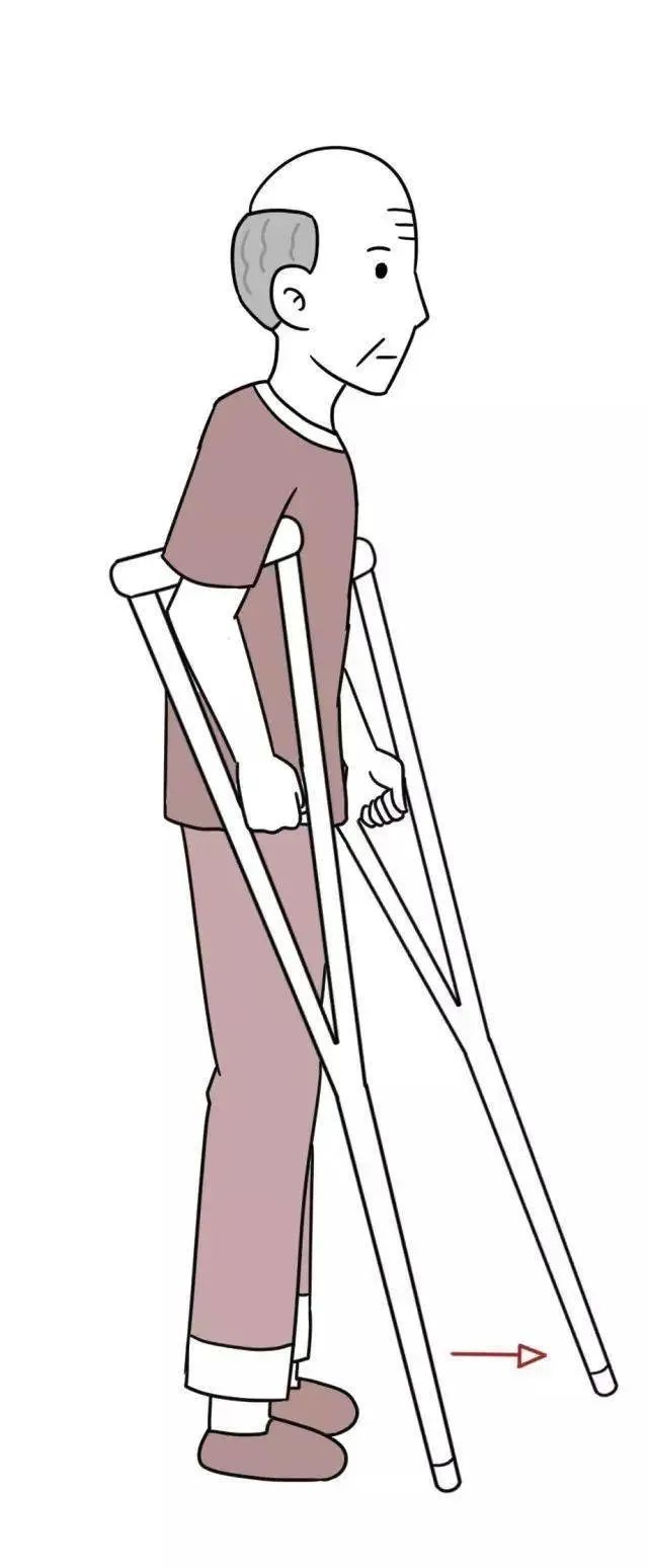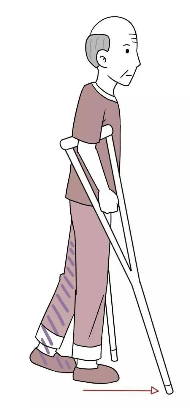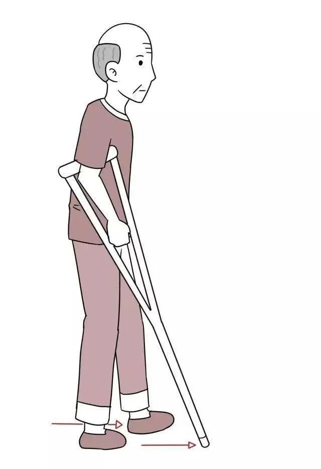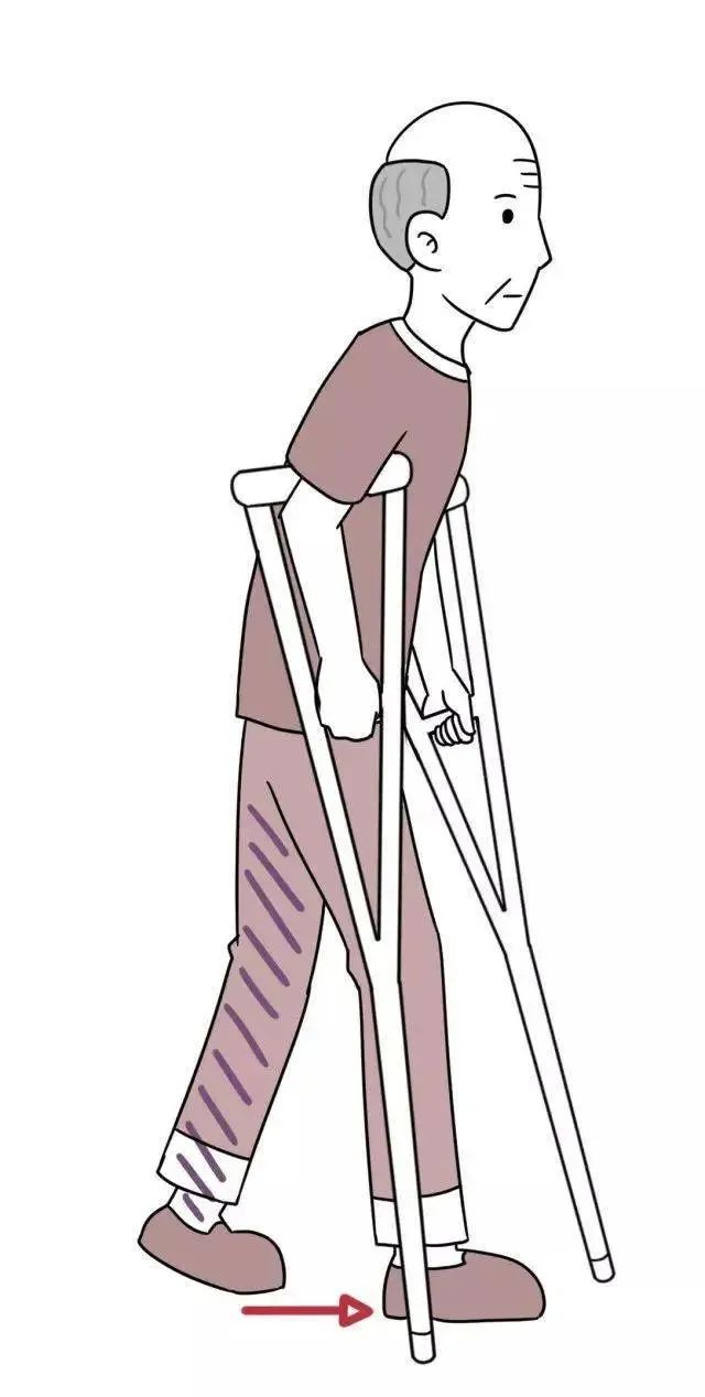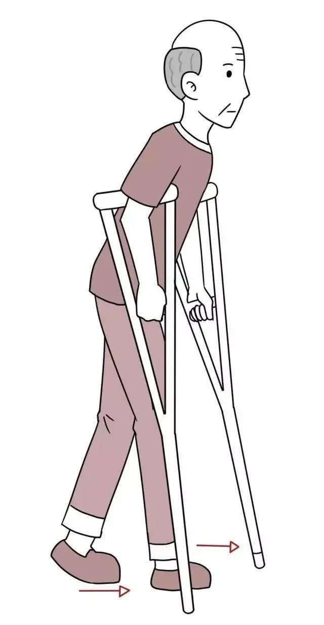 3) 四点步行法:先出健侧拐杖,出患足,后出患侧拐杖,健足跟上。