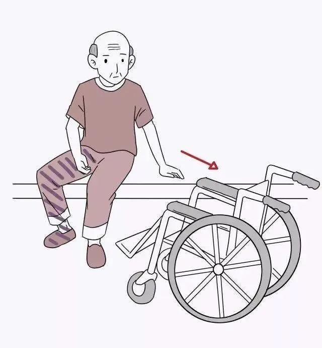 照护人员将轮椅推至床边,与床呈30-45度角,并靠近老年人健侧,固定轮椅,脚踏板向上抬起,指导老年人一手扶住轮椅扶手,缓慢从床移动到轮椅上。