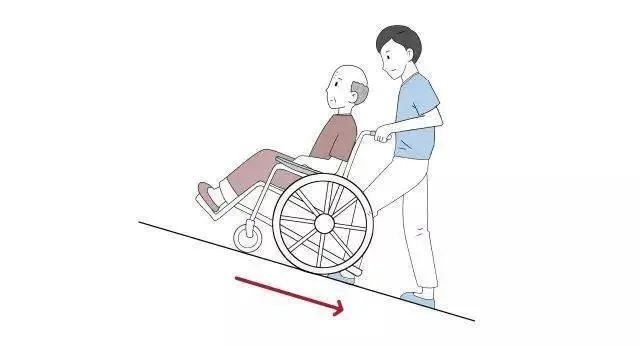 下坡时照护者将轮椅背向坡道,一边支撑轮椅,一边退行,注意刹车,控制好轮椅下坡速度。