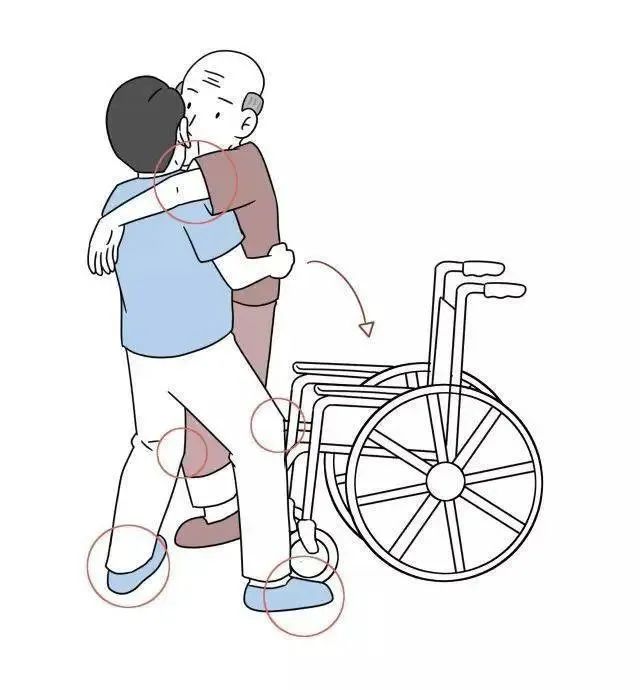照护人员站于老年人患侧,一手手心向上扶住老年人患手,另一手扶住老年人腋下或腰部,指导老年人健手扶住轮椅扶手,以健侧为支撑转身坐入轮椅。