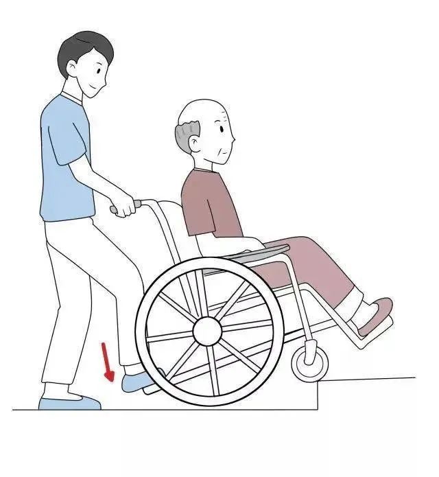 下台阶时轮椅背向前进方向,照护人员抬起手柄,慢慢平稳落下后轮,照护人员抬起前轮向后退,脚踏板和脚尖避免碰撞台阶,前轮轻轻落下。