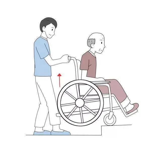 上台阶时照护人员抬起前轮到下一个台阶后放下前轮,继续前进,后轮碰到台阶时,一边抬起手柄,一边推行,尽量减少后轮撞击。