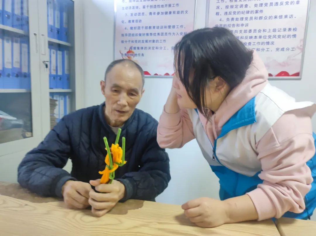 有些爷爷奶奶手指不太灵活,在制作过程中遇到困难时,工作人员就上前帮助,协助他们共同完成。