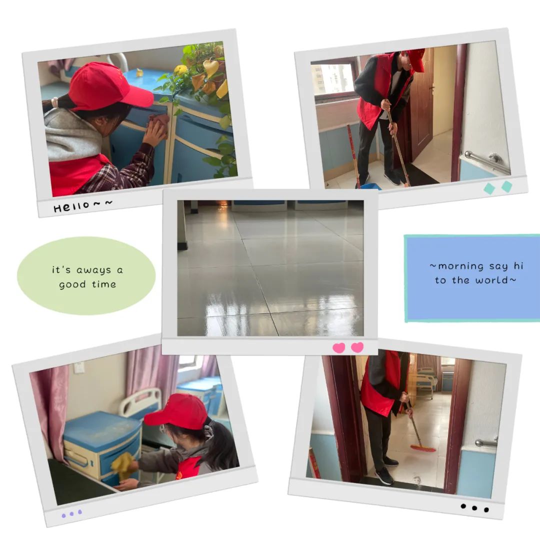 为了提供一个整洁、舒适的活动环境,志愿者们一起清洁和整理活动区域。大家协作有序,迅速完成了清洁工作,保持了活动现场的整洁。并且上到楼层为老人打扫生活区域,现场志愿者干活非常卖力
