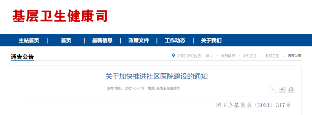 近日,国家卫生健康委印发此《通知》,加快推进社区医院建设,进一步完善基层医疗卫生服务体系,切实巩固提升县域医疗卫生服务能力和水平,基层医疗机构建设将掀起新高潮!