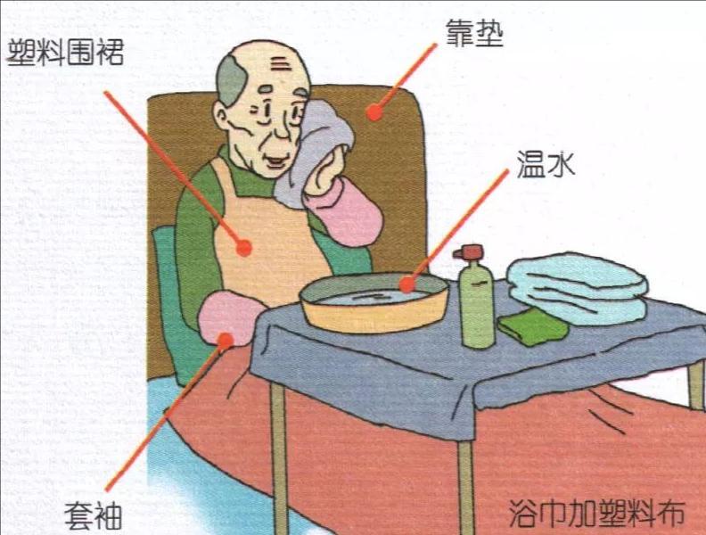老人戴上塑料围捃和套袖,照护者将水盆置于胸前小桌上。水不要太烫。如果衣服弄湿了,为防止着凉,要尽快更换衣服,替换的衣服要触手可及。