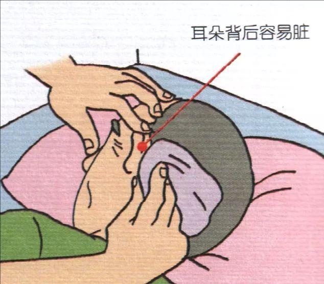 方法基本与坐姿相同。但是耳朵后面、脖子的皱纹、下巴下方要将老人的头侧转后才好擦拭。照护者的动作要轻柔。