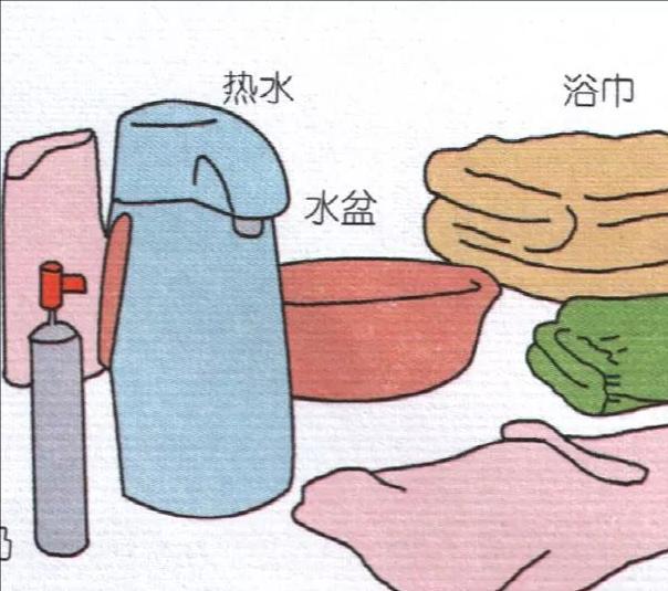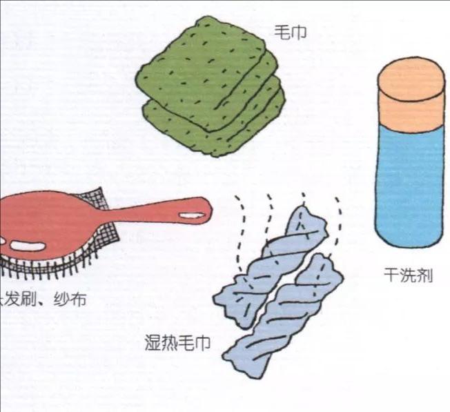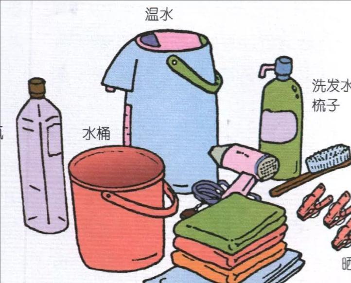 大块厚塑料布、毛巾、浴巾、大塑料饮料瓶、水桶、晒衣夹子、洗发水、护发素、吹风机、温水。