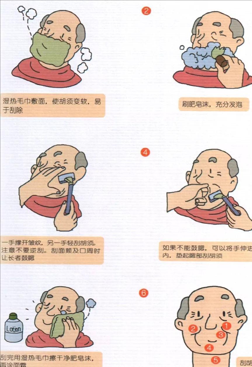 照护者帮助剃须时动作要轻柔,一手舒展面部皱纹,一手持剃须刀轻刮。尽量不要逆刮,以免损伤皮肤。刮口周及鼻下部分时,可让老人鼓腮配合。