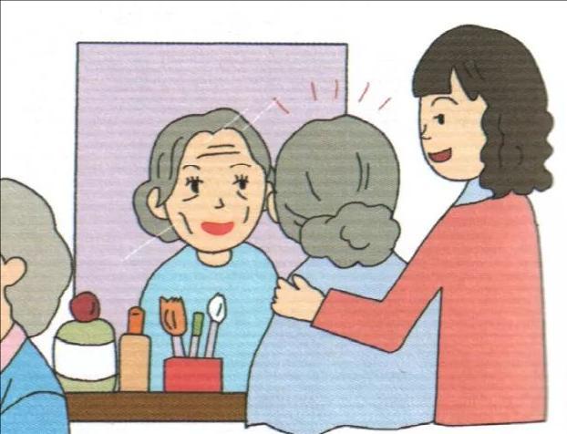 对着镜子看到自己变得年轻漂亮,真令人高兴。照护者可以让老人对着镜子,夸奖她,让她更加快乐。