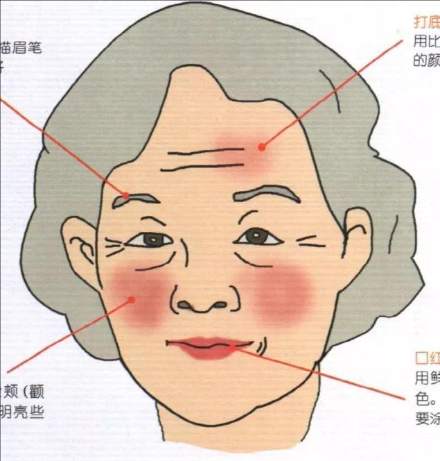 给老年女性化妆的要点是:快。化妆的顺序和平常一样。用化妆水和乳液给面部皮肤补充水分和油脂,涂底霜、扑底粉之后再扑些散粉。